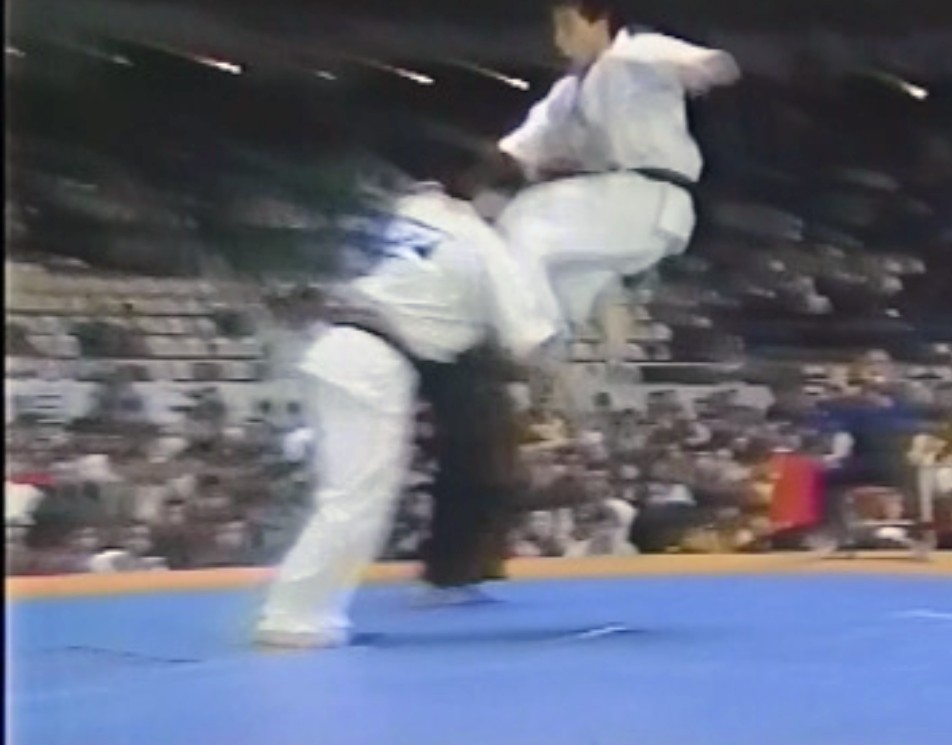 全日本大会で極真本部道場の豊田という、あまり実績のない選手が格闘マシーンと異名を持つ、当時「極真三強」の一人といわれた、黒沢浩樹選手の強力な下段蹴りに対し、ピョンピョン飛び跳ね避けながら、黒沢選手のアゴに跳びヒザ蹴りをヒットさせダウンを取り、一本勝ちしたことがありました。